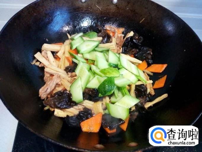 放入腐竹翻炒,浸泡变软的腐竹,略炒一下即可,放入黄瓜片翻炒,放入盐。