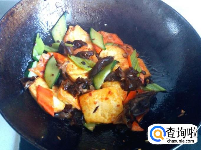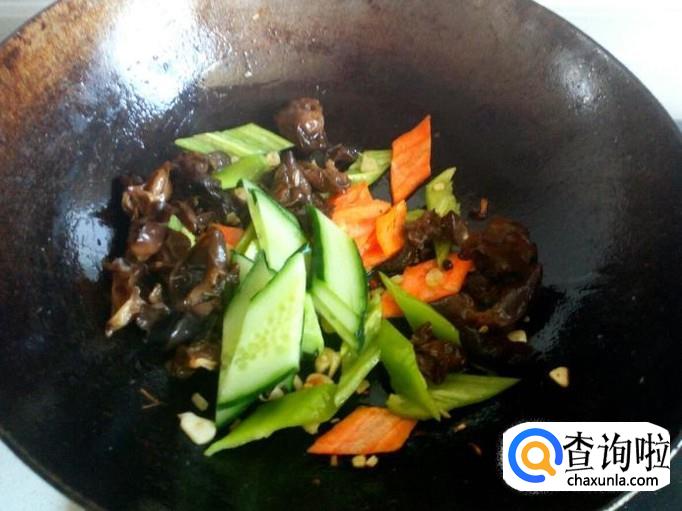 炒至木耳变软,先放入青尖椒,后放入黄瓜,炒至断生。