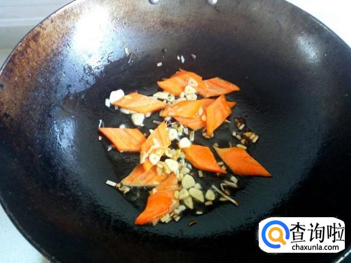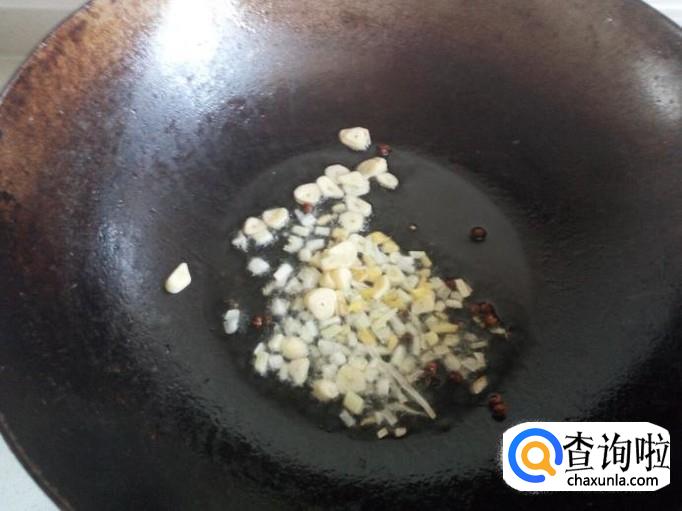 锅内重新放油加热,油热后放入花椒,葱,姜,蒜爆锅,放入胡萝卜略翻炒一下。