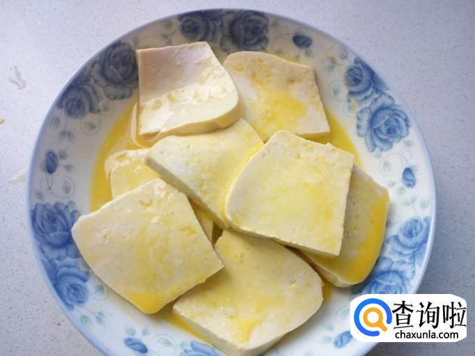 把切好的豆腐放入蛋液中,让豆腐两面都粘上蛋液。