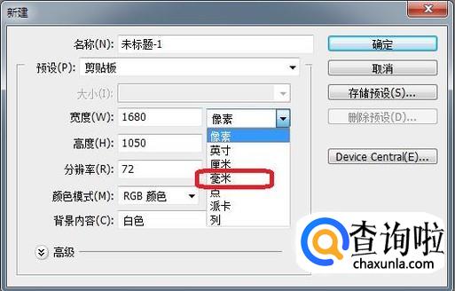 系统默认图形是以像素来定义图形尺寸的,我们改成毫米,并设置宽度和高度略小于A4纸大小,比如宽度205,高度292。设置完点击确定。