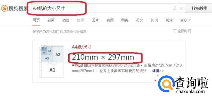 首先,我们需要知道A4纸的具体尺寸,可以自己动手测量, 也可以去网上搜索答案,我们通过搜狗立知,得到A4具体尺寸是210*297mm。