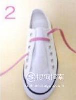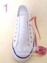 第一步,拿出一只鞋子,把鞋子上面的鞋带拆下来。把鞋子摆正,鞋尖的那一头对着自己,然后拿出一根鞋带从离鞋跟最近的孔开始从外往内穿,再穿过同一侧的第二个孔。