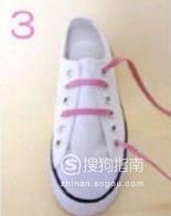 接下来我们再把鞋带拉到另外一侧第三个孔,从外向内穿,在同一侧空一个孔从内向外穿出。