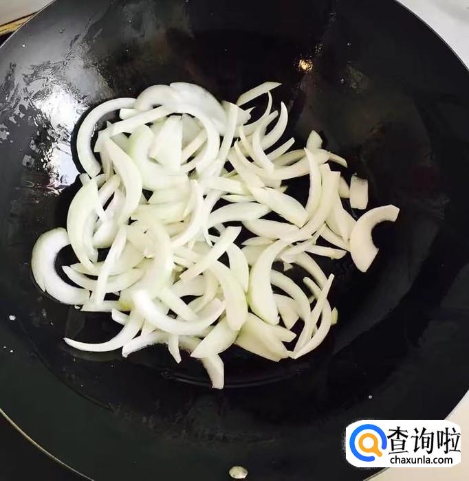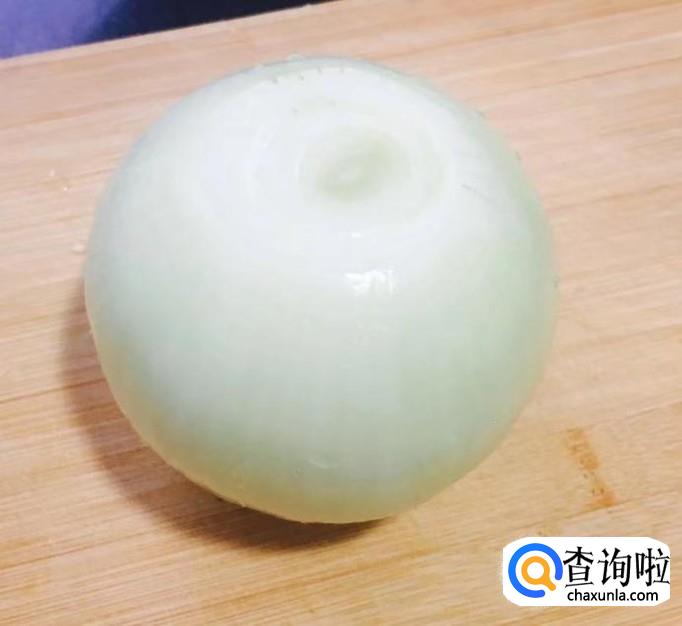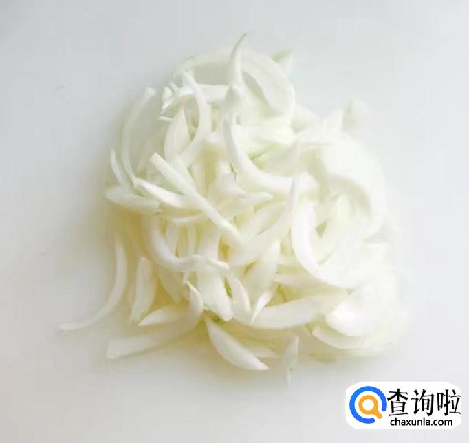 洋葱一个切去两端剥去外皮清洗干净,然后切成粗丝备好