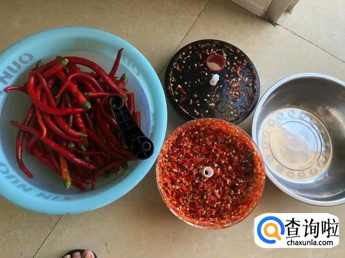 用切菜神器将晾干后的辣椒切碎约为黄豆大小,然后在切碎的辣椒中加入60克盐腌制