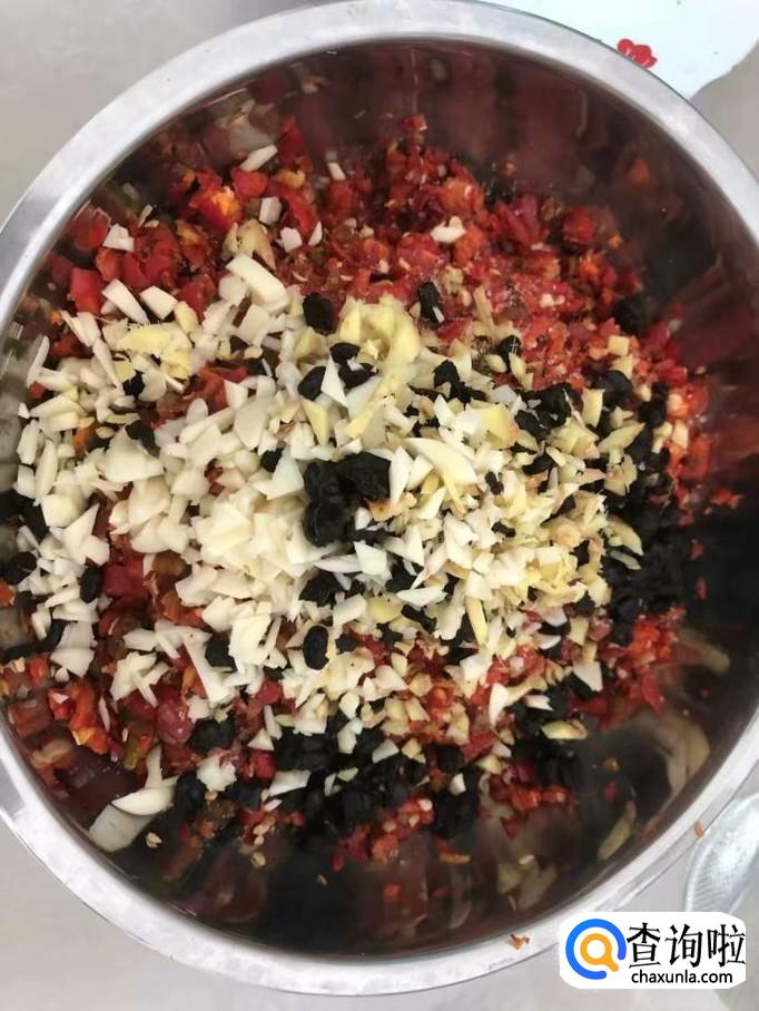 将一个去皮后的蒜头,50克生姜(切成米粒大小)以及80克豆豉倒入红辣椒中,再加30克白糖,2勺白酒,拌匀。