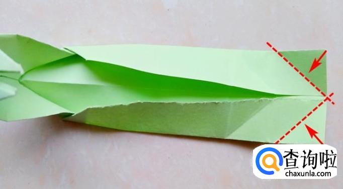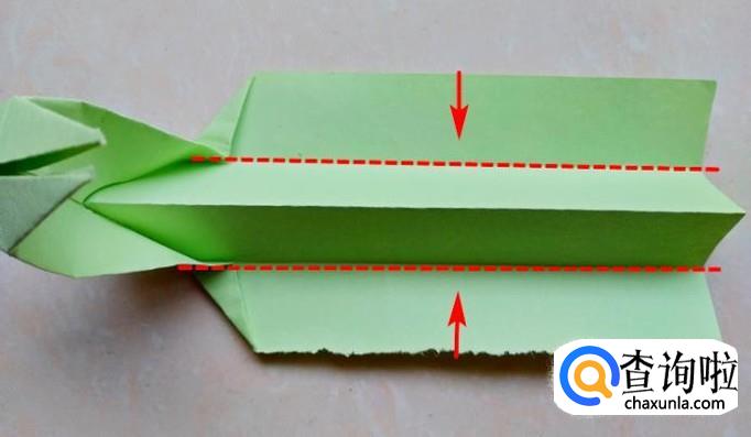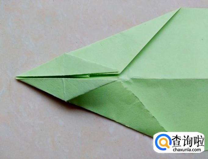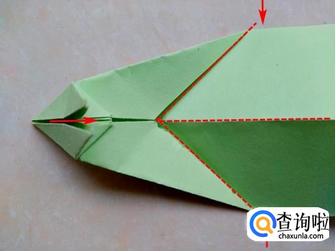 尾部按照前面的折痕叠在一起,按图中样子折出四条折痕,用于尾部折叠;