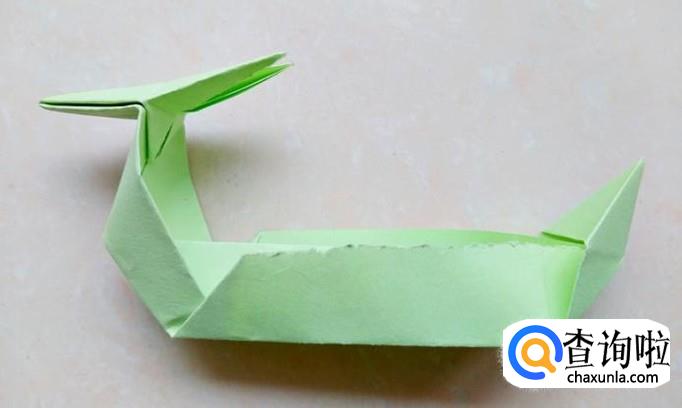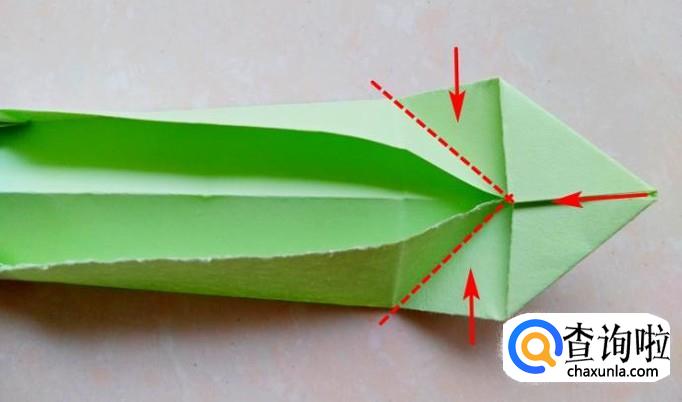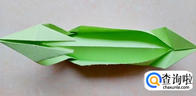 拉着尾部向上提,箭头位置沿着虚线先向中间合拢,龙舟的基本形状就折好了;