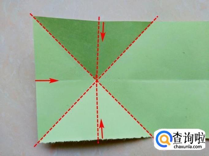 选择短边一头,折出米字型折痕,按图中虚线,上下两边向中间合拢,同时左边向右对折,形成一个三角形;