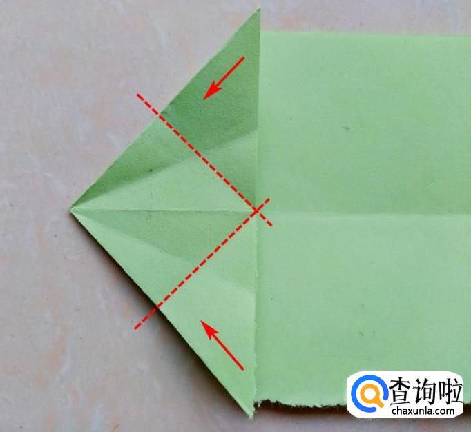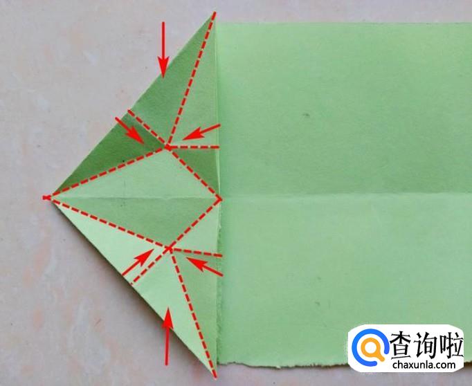 利用前两步的折痕按图示虚线,将两个尖角部分捏对折并向中间合拢;