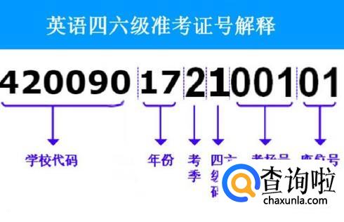 四级准考证号共15位数字,前6位是学校的代码,接着的2位是年份,1位是考季,1位是四六级代码,3位是考场号,2位是座位号。