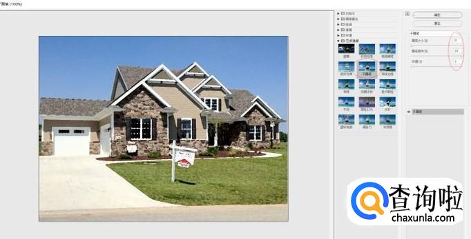 在 艺术效果 一栏里,选择 干画笔,大小,细节,纹理,参考下图配置,一般为0,10,1,点击确定保存