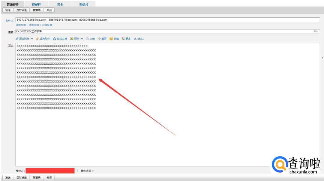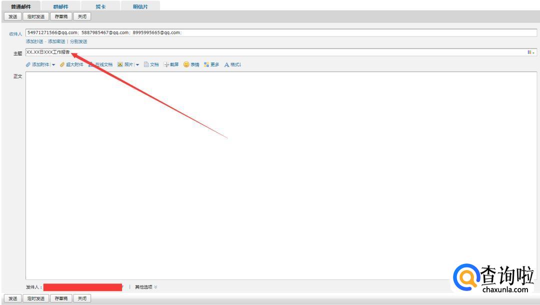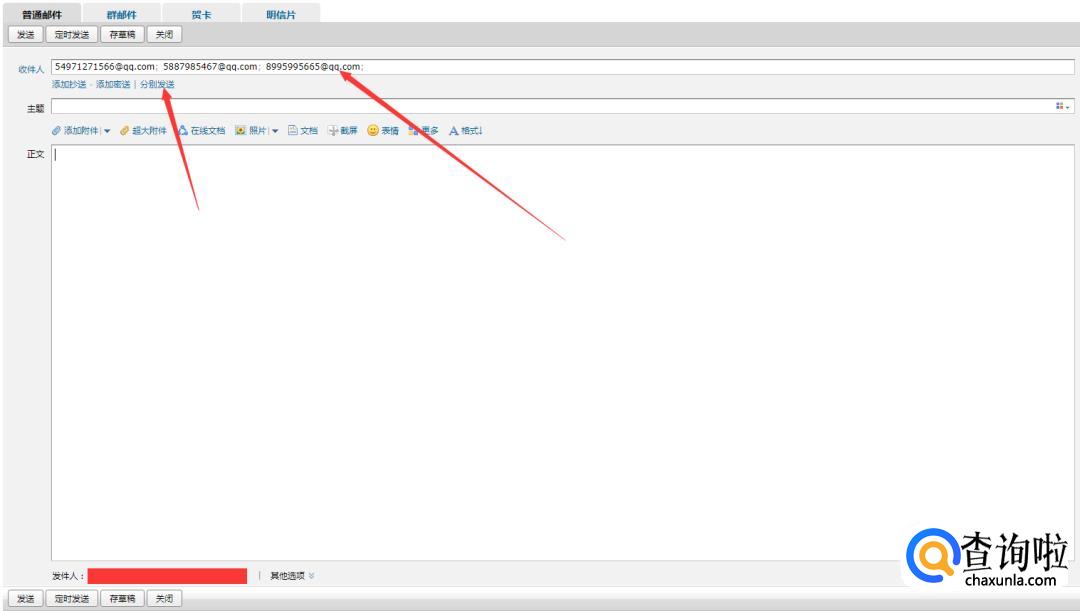 先填写收件人,我们需要知道收件人的邮箱,这里可以填写一个或者几个人的邮箱,也可以选择分别发送或者一起发送(如果是使用的QQ邮箱就写QQ的,如13584324@qq.com,因为每个公司的后缀不一样)。