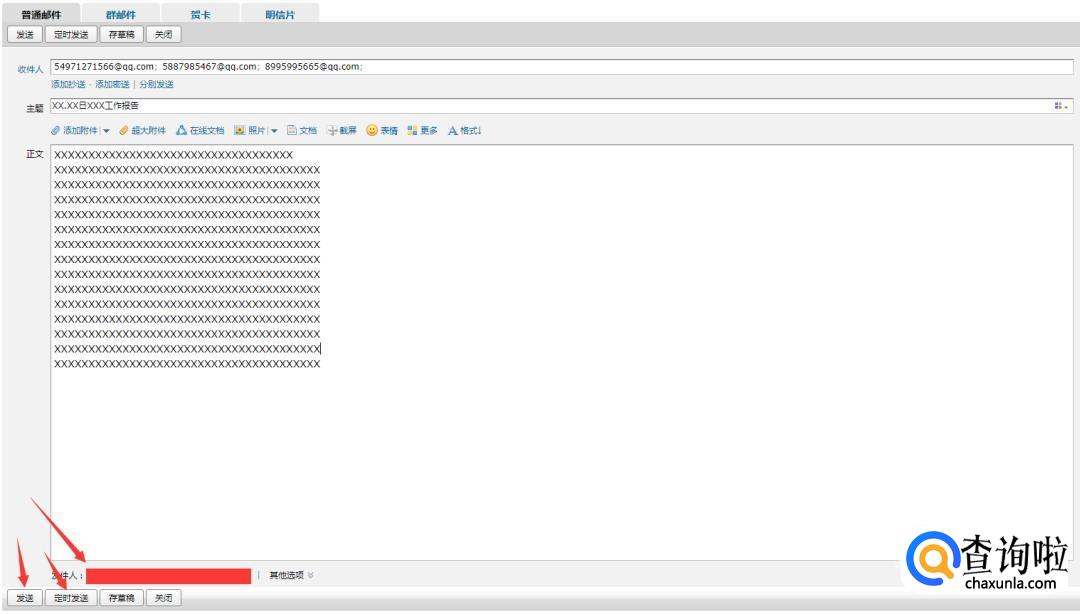 最后在发件人的位置填写好自己的信息,选择发送或者是自己定时间发送给对方就完成了。