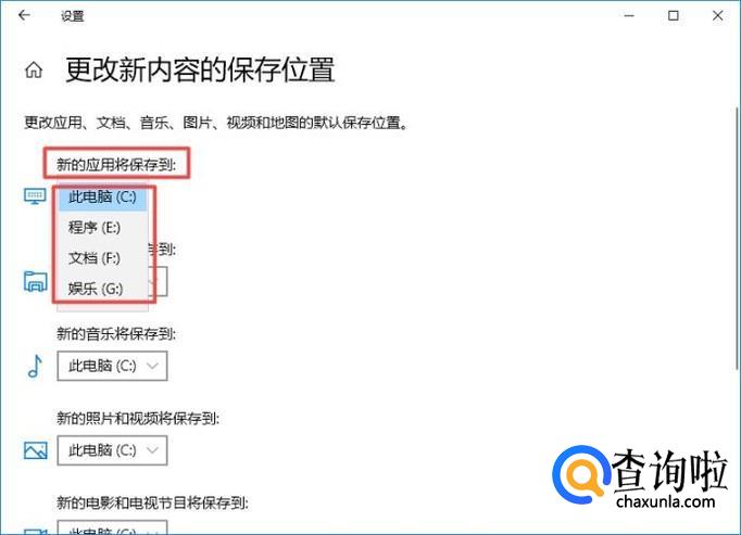 弹出的界面,我们点击新的应用将保存到边上的下拉箭头,弹出的界面,我们根据我们的需求点击选择一个位置,这样我们就更改了软件安装的路径了。