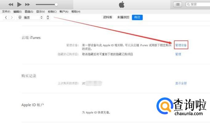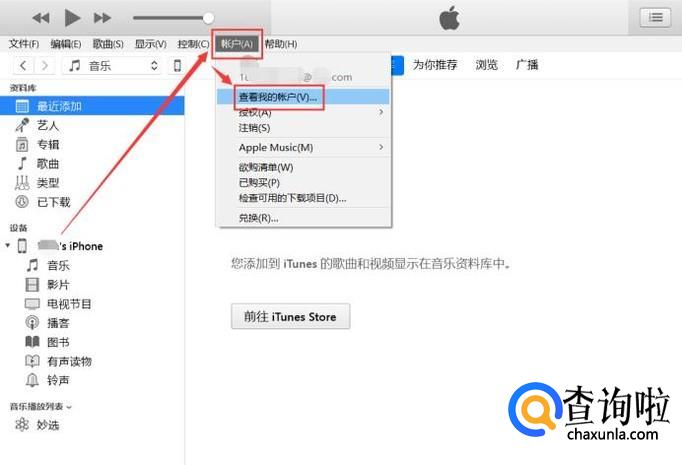 把手机连接到电脑上面,打开iTunes,点击“账户”下拉列表中的“查看我的账户”。