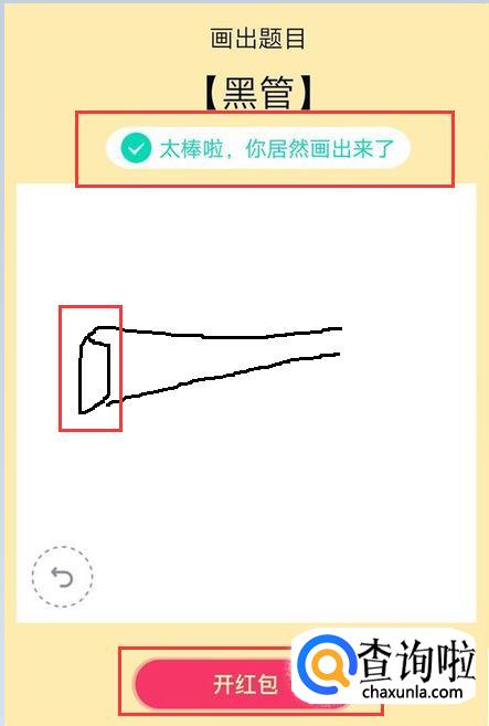 然后在喇叭口处画一个圈,这样看到提示画出来了,说明黑管就画对了。点击下面的开红包即可。