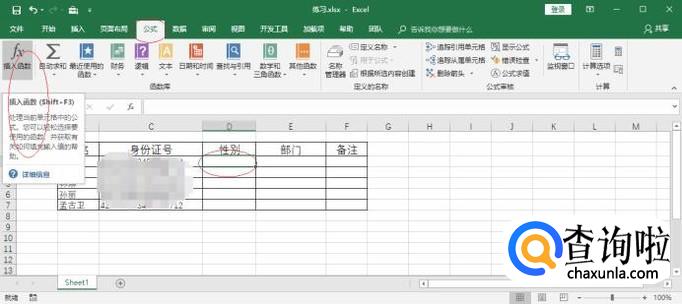 如图所示,选中"性别"单元格数据区域。选择"公式→函数库"功能区,点击"插入函数"图标。