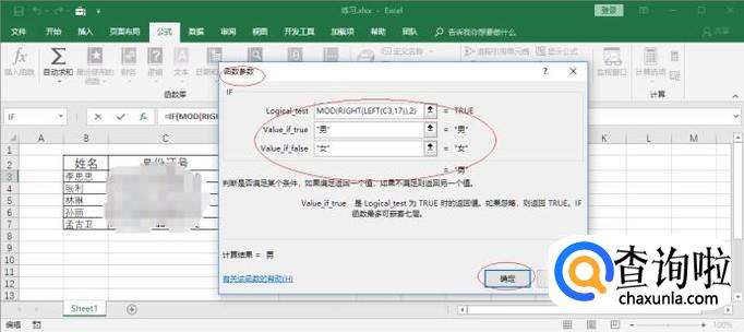 弹出"函数参数"对话框,如图所示。函数参数文本框输入函数参数,完整公式为"=IF(MOD(RIGHT(LEFT(C3,17)),2),"男","女")"。
