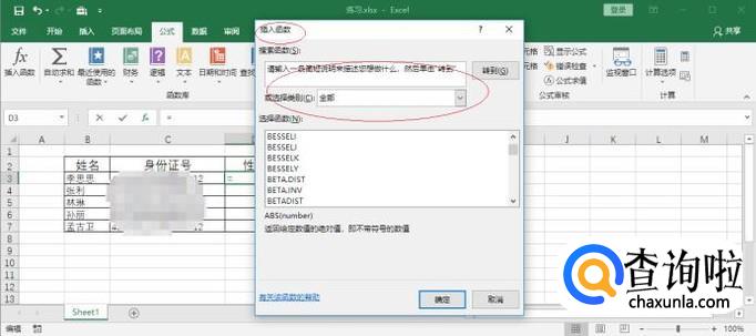 弹出"插入函数"对话框,如图所示。点击"搜索函数或选择类别"右侧向下箭头,下步将进行利用公式根据身份证号码自动填写性别的操作。