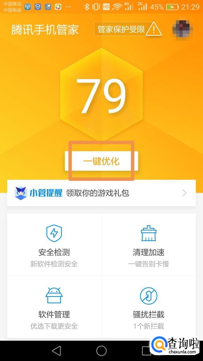 首先找到并打开自己手机里的腾讯手机管家,进入到首页,会有一个对手机的综合评分,如果评分低可以点击分数下面的一键优化,对手机进行初步的内存清理,安全检测等优化。