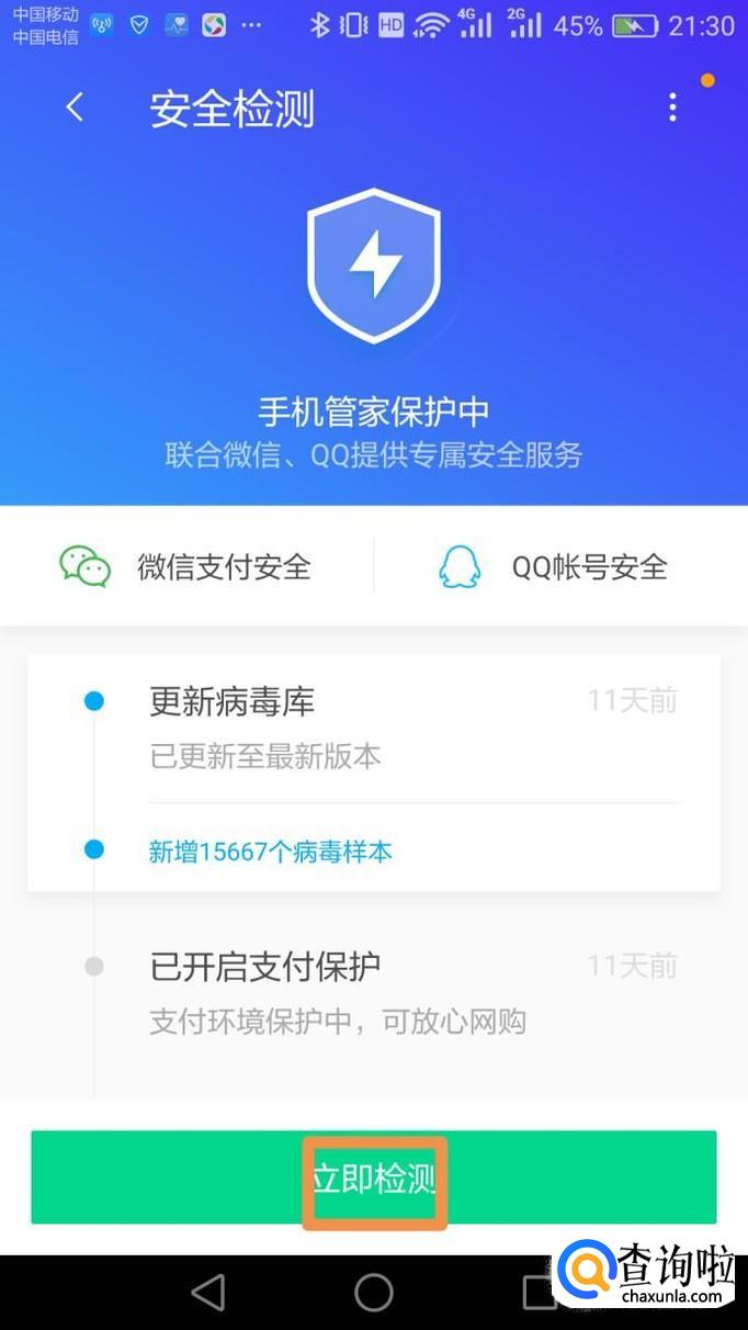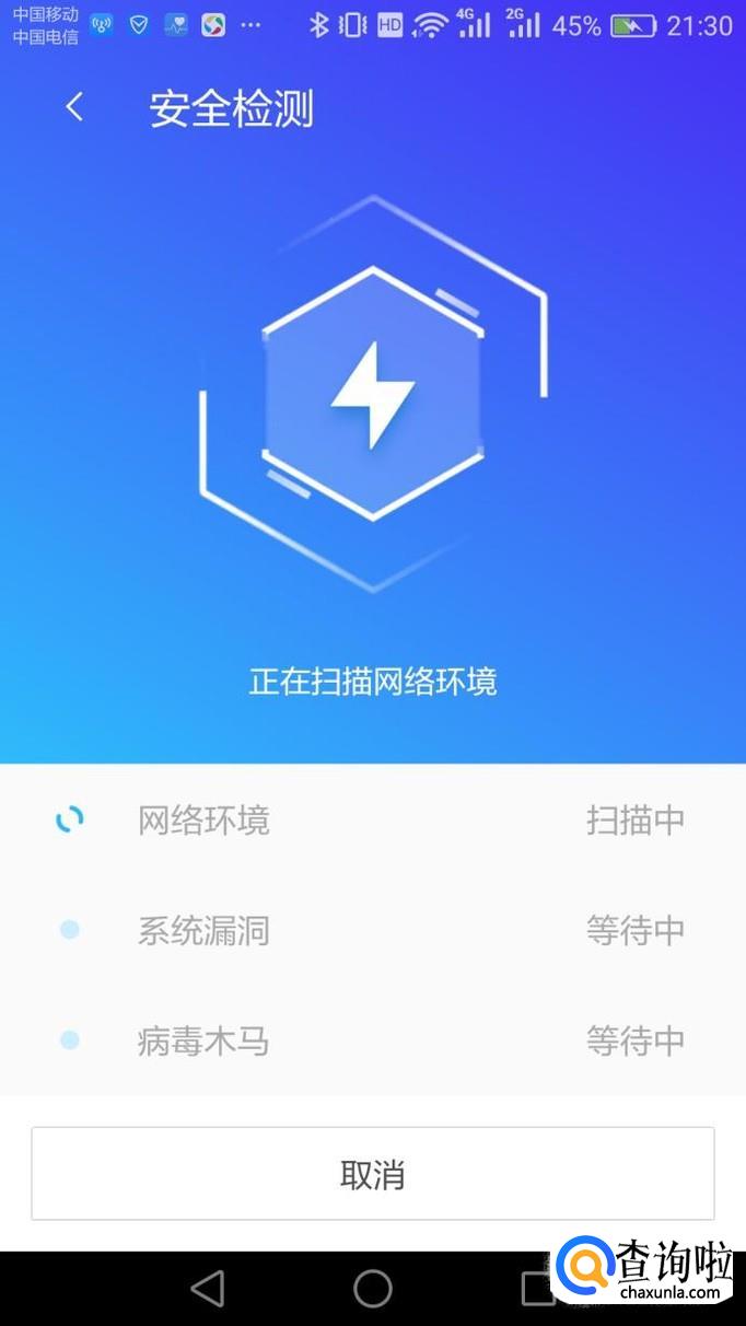 接下来可以点击首页的“安全检测”,进入再点击下面的“立即检测”,对手机的支付安全、网络环境、系统病毒、病毒木马等安全项目进行检测,保证手机的安全使用。