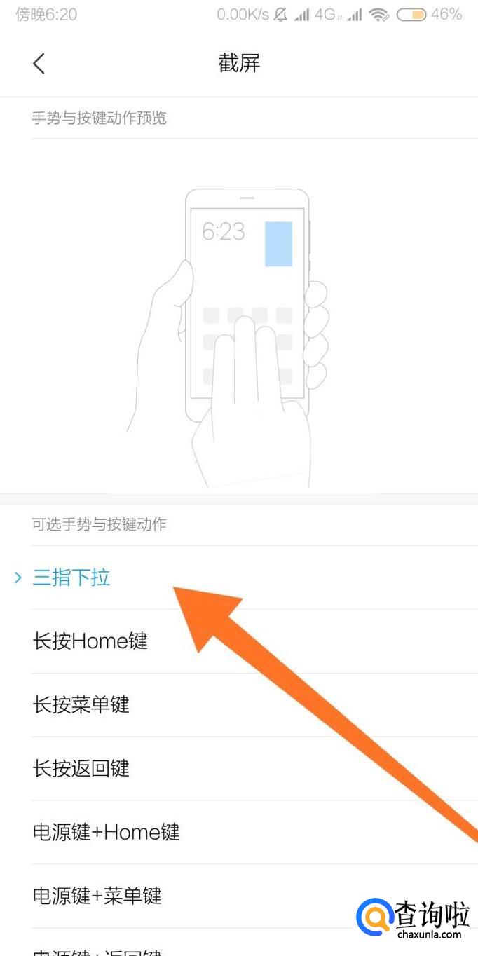 最后把截屏的快捷方式设置为“三指下拉”即可,设置完成之后,用三指手指在手机屏幕上滑动即可截屏。