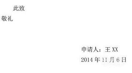 正文结束后,要在下面两行写上“此致敬礼,”之后在右下角写上“申请人:XXX,申请日期:X年X月X日”,然后递交上去即可,注意页面一定要整洁。