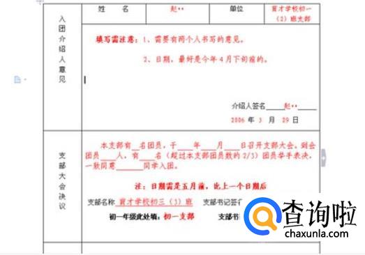 根据被介绍人的表现写出综合性的意见,写明介绍人的优缺点,表明对被介绍人能否入团的态度。介绍人签名,总支部委员会意见应写总支委员会的审议结果并由总支部书记签名,其他栏目要填写完整。