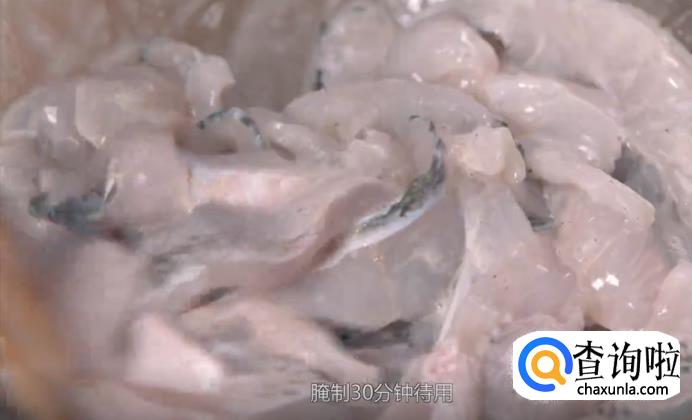 切好的鱼肉装进碗里,再往里加料酒、盐、白胡椒、生粉和蛋清,将其搅拌均匀,放在一旁腌制30分钟待用。