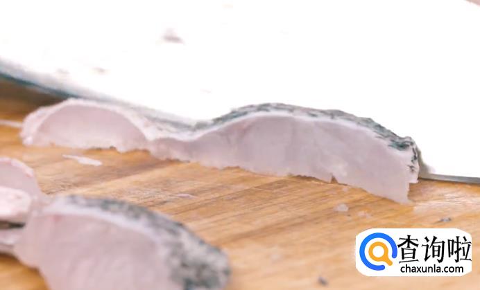 新鲜鲈鱼处理干净以后,先平刀切片出上下两大块鱼肉,接着再斜刀片切成小片。