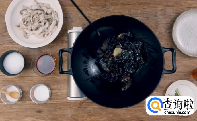 重新起锅,倒入少许油,开中小火,放入姜片爆香,再倒入木耳翻炒。