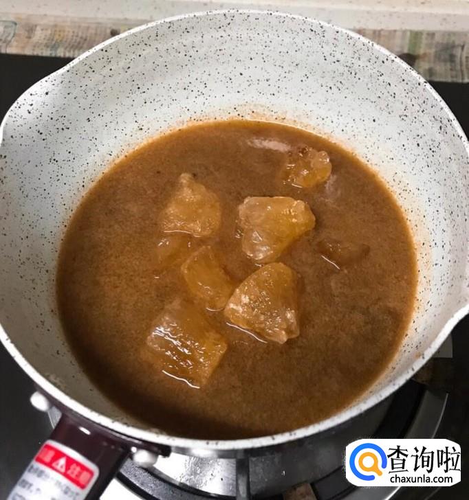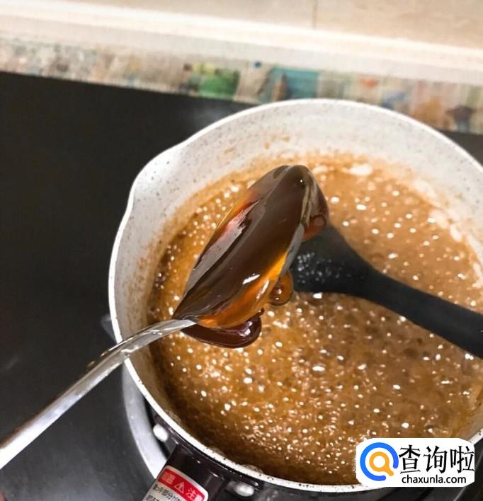熬到沸腾之后,加入一勺麦芽糖,(根据汁的量可以适量改变麦芽糖的量),继续熬,熬到滴一滴冷水可以凝固的程度就OK!