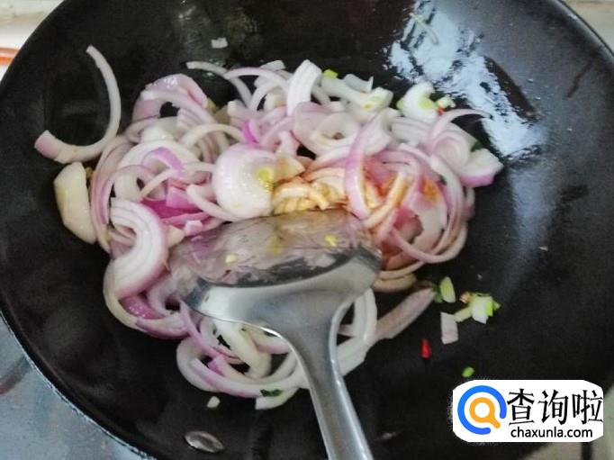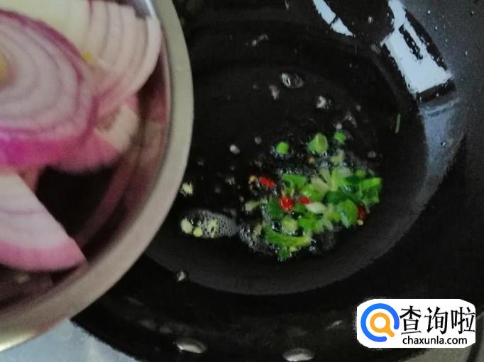 炒好鸡蛋后准备炒圆葱,炒锅放油油热后放入葱末和辣椒,炒香后放入圆葱快速翻炒均匀,因为圆葱也能直接生吃,所以翻炒一下就可以加生抽。