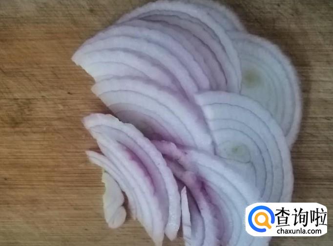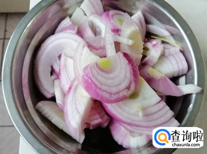 把洗好的圆葱从中间切开一分为二,然后再如图把圆葱切成圆葱丝,把切好的圆葱盛入容器中待用,当然也可以根据自己喜好切成块。