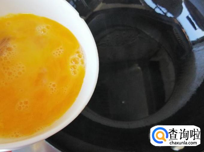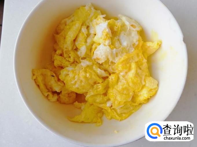 炒锅放油先把鸡蛋炒好待用。炒锅放油油热后把打散的鸡蛋液倒入油锅,用筷子把鸡蛋划散,然后用铲子把鸡蛋翻炒均匀,等鸡蛋完全凝固盛入碗中。