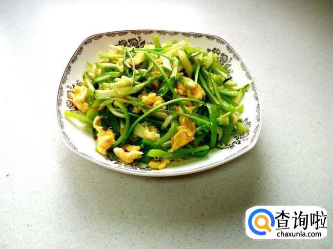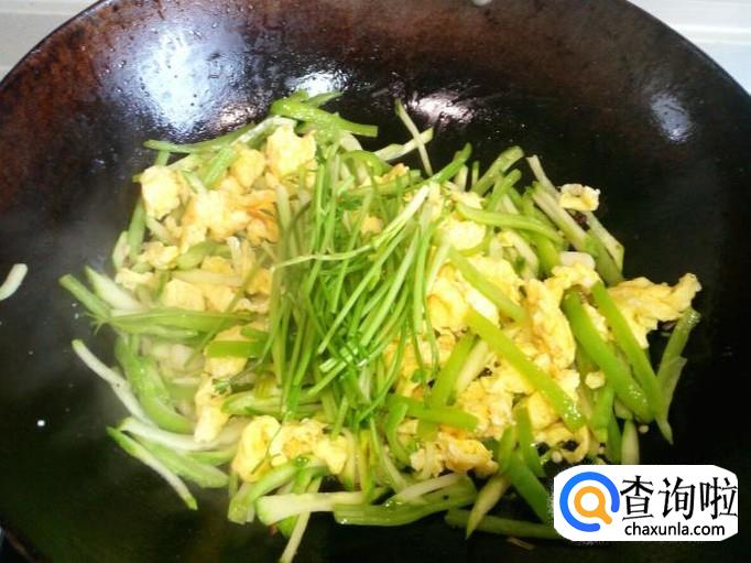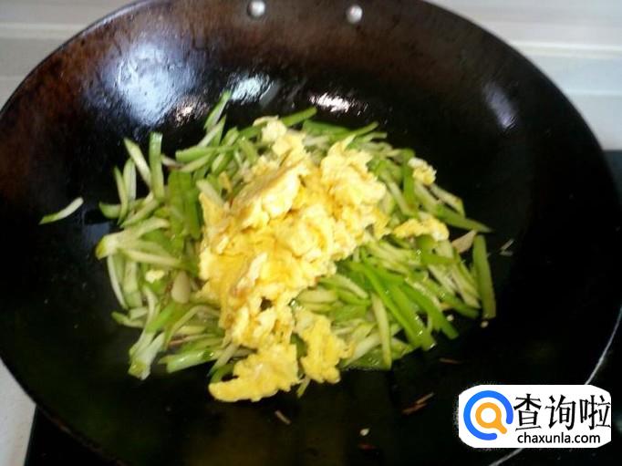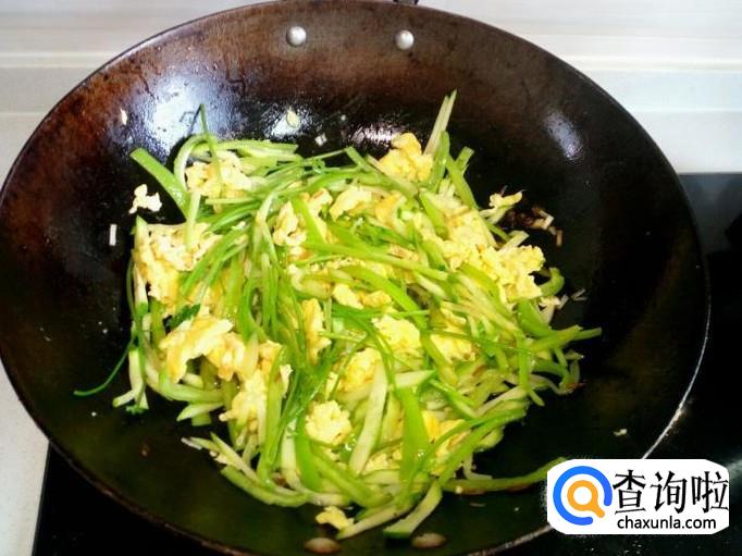 青尖椒略翻炒即可,放入黄瓜丝颠勺翻一下个,随即放入炒好的鸡蛋,再颠勺翻一下个。