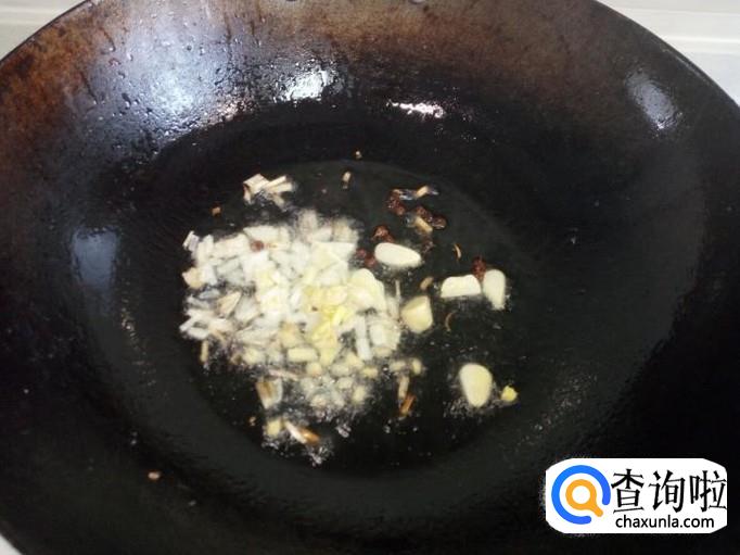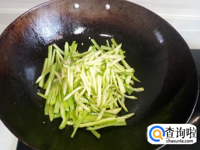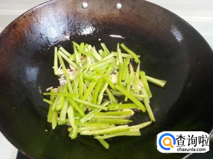 锅内放入油加热,油热后放入葱,姜,蒜爆锅,放入青椒丝翻炒,放入少许料酒,放入盐。