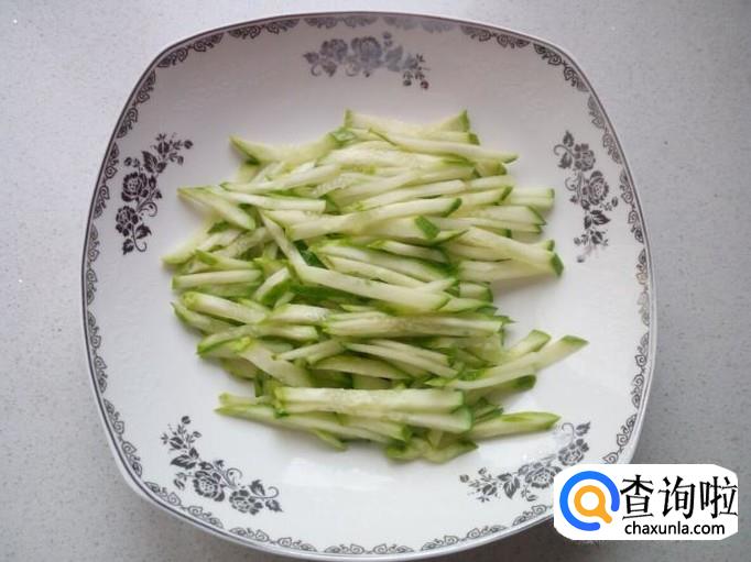 黄瓜用水清洗干净,控干水分,切成丝。