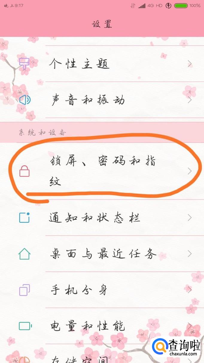 然后找到锁屏、密码和指纹