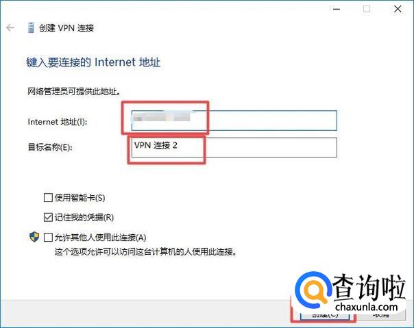 弹出的界面,我们输入Internet地址和名称,之后我们点击创建就设置好了。