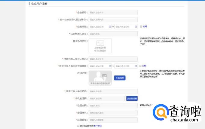 如果你选择“企业用户注册”,需要按要求提交企业的名称、营业执照、统一组织机构代码证、法人代表身份证、法人代表手机号等。
