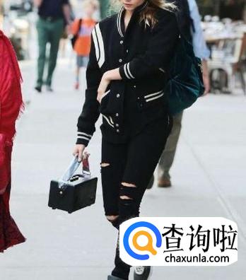黑色运动鞋搭配白条图案黑外套,下配黑色破洞牛仔裤,整体颜色非常协调,而且显得特别时尚、有气质,适合年轻女性穿着。