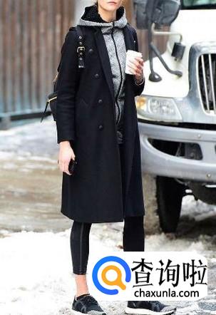 黑色运动鞋搭配灰色卫衣,外套一件黑色大衣,下配一条黑色紧身七分裤,整体效果保暖又不失沉重感,给人一种轻松的感觉。