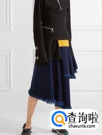 黑色运动鞋搭配不对称的黑色上衣和深蓝色半裙,突出人的个性,显得很前卫,这种搭配比较适合性格活泼、有特点的女生。