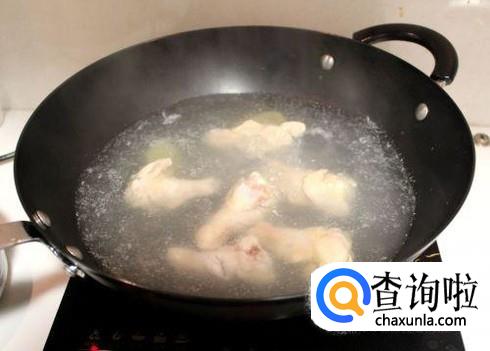 然后我们需要把从超市买回来的鸡腿洗净,放入锅里面煮去除浮沫,为了去除腥味我们可以加入一些料酒或者姜片。