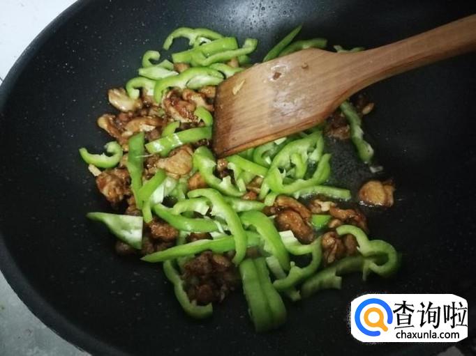 然后葱姜蒜爆香,将青椒切碎,放入锅里面翻炒,然后倒入鸡腿肉或者鸡腿碎炒,然后倒入生抽、糖等,出锅前用水闷熟。