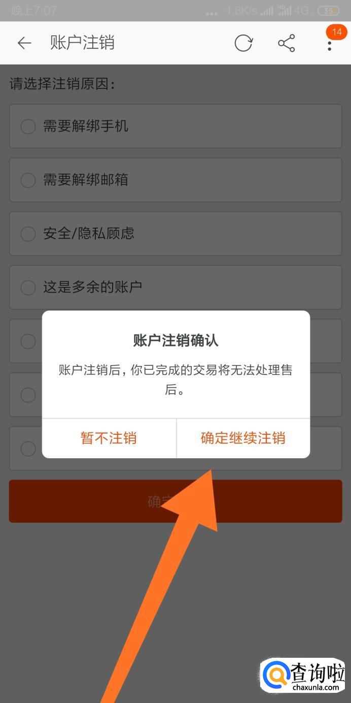 确认无误后,接着点击“确定继续注销”按钮。