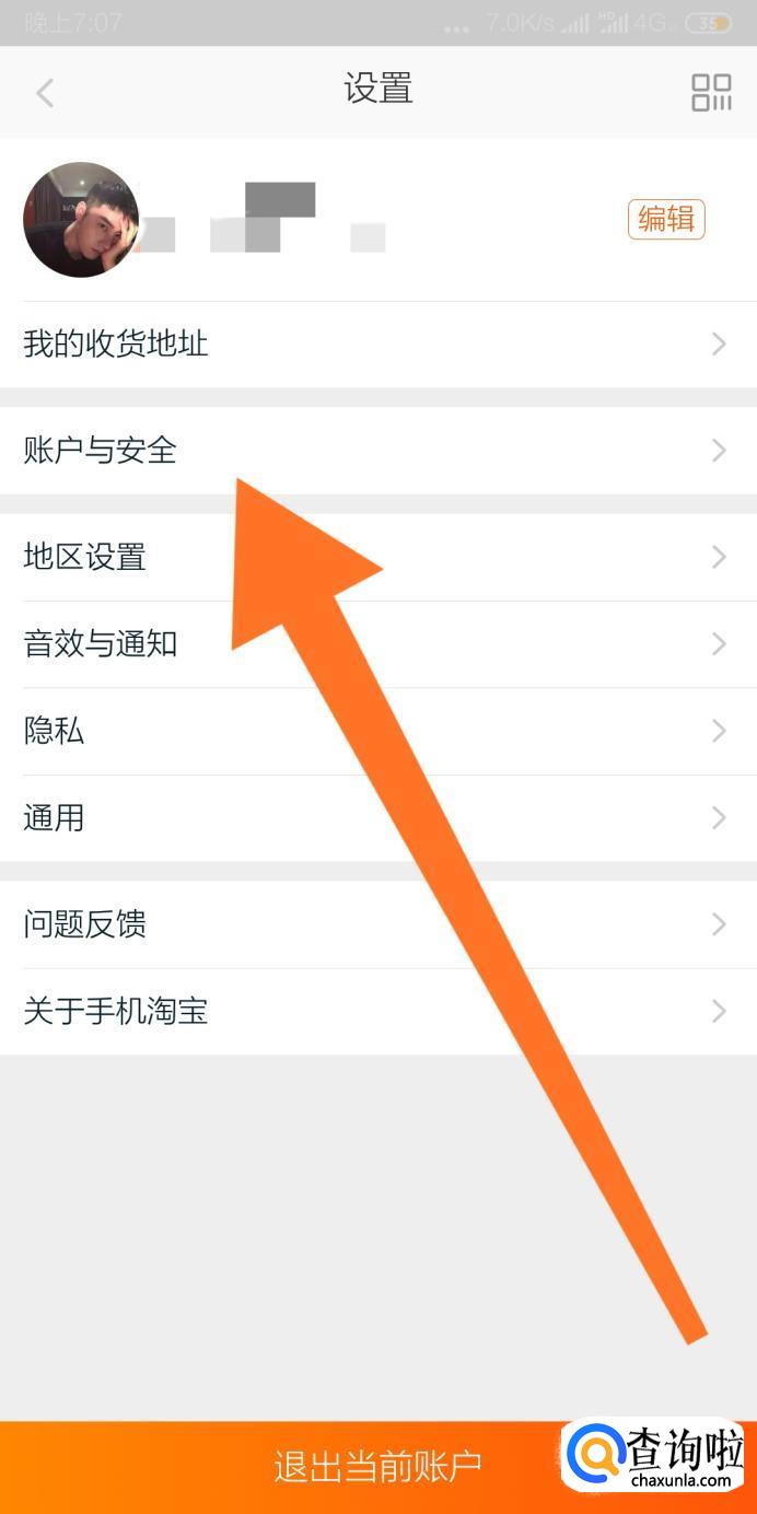 进入手机淘宝APP设置菜单页面后,再点击进入“账户与安全”设置选项。